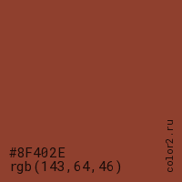 Цвет #8F402E в цветовой модели RGB обозначается тремя октетами (143, 64, 46) в десятичном формате и #8F402E в шестнадцатиричном (hex) формате, которые являются интенсивностью красного 143 (hex 8F), интенсивность зелёного 64 (hex 40) и интенсивность синего 46 (hex 2E).
