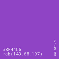 Цвет #8F44C5 в цветовой модели RGB обозначается тремя октетами (143, 68, 197) в десятичном формате и #8F44C5 в шестнадцатиричном (hex) формате, которые являются интенсивностью красного 143 (hex 8F), интенсивность зелёного 68 (hex 44) и интенсивность синего 197 (hex C5).