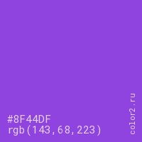 Цвет #8F44DF в цветовой модели RGB обозначается тремя октетами (143, 68, 223) в десятичном формате и #8F44DF в шестнадцатиричном (hex) формате, которые являются интенсивностью красного 143 (hex 8F), интенсивность зелёного 68 (hex 44) и интенсивность синего 223 (hex DF).