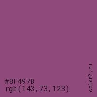 Цвет #8F497B в цветовой модели RGB обозначается тремя октетами (143, 73, 123) в десятичном формате и #8F497B в шестнадцатиричном (hex) формате, которые являются интенсивностью красного 143 (hex 8F), интенсивность зелёного 73 (hex 49) и интенсивность синего 123 (hex 7B).