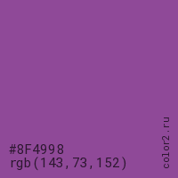 Цвет #8F4998 в цветовой модели RGB обозначается тремя октетами (143, 73, 152) в десятичном формате и #8F4998 в шестнадцатиричном (hex) формате, которые являются интенсивностью красного 143 (hex 8F), интенсивность зелёного 73 (hex 49) и интенсивность синего 152 (hex 98).