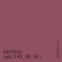 Цвет #8F5060 в цветовой модели RGB обозначается тремя октетами (143, 80, 96) в десятичном формате и #8F5060 в шестнадцатиричном (hex) формате, которые являются интенсивностью красного 143 (hex 8F), интенсивность зелёного 80 (hex 50) и интенсивность синего 96 (hex 60).