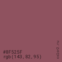 Цвет #8F525F в цветовой модели RGB обозначается тремя октетами (143, 82, 95) в десятичном формате и #8F525F в шестнадцатиричном (hex) формате, которые являются интенсивностью красного 143 (hex 8F), интенсивность зелёного 82 (hex 52) и интенсивность синего 95 (hex 5F).