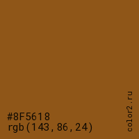 Цвет #8F5618 в цветовой модели RGB обозначается тремя октетами (143, 86, 24) в десятичном формате и #8F5618 в шестнадцатиричном (hex) формате, которые являются интенсивностью красного 143 (hex 8F), интенсивность зелёного 86 (hex 56) и интенсивность синего 24 (hex 18).
