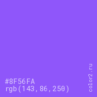 Цвет #8F56FA в цветовой модели RGB обозначается тремя октетами (143, 86, 250) в десятичном формате и #8F56FA в шестнадцатиричном (hex) формате, которые являются интенсивностью красного 143 (hex 8F), интенсивность зелёного 86 (hex 56) и интенсивность синего 250 (hex FA).