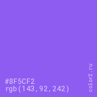 Цвет #8F5CF2 в цветовой модели RGB обозначается тремя октетами (143, 92, 242) в десятичном формате и #8F5CF2 в шестнадцатиричном (hex) формате, которые являются интенсивностью красного 143 (hex 8F), интенсивность зелёного 92 (hex 5C) и интенсивность синего 242 (hex F2).