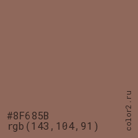 Цвет #8F685B в цветовой модели RGB обозначается тремя октетами (143, 104, 91) в десятичном формате и #8F685B в шестнадцатиричном (hex) формате, которые являются интенсивностью красного 143 (hex 8F), интенсивность зелёного 104 (hex 68) и интенсивность синего 91 (hex 5B).
