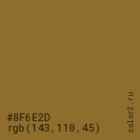 Цвет #8F6E2D в цветовой модели RGB обозначается тремя октетами (143, 110, 45) в десятичном формате и #8F6E2D в шестнадцатиричном (hex) формате, которые являются интенсивностью красного 143 (hex 8F), интенсивность зелёного 110 (hex 6E) и интенсивность синего 45 (hex 2D).