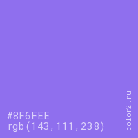 Цвет #8F6FEE в цветовой модели RGB обозначается тремя октетами (143, 111, 238) в десятичном формате и #8F6FEE в шестнадцатиричном (hex) формате, которые являются интенсивностью красного 143 (hex 8F), интенсивность зелёного 111 (hex 6F) и интенсивность синего 238 (hex EE).