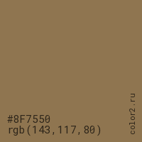 Цвет #8F7550 в цветовой модели RGB обозначается тремя октетами (143, 117, 80) в десятичном формате и #8F7550 в шестнадцатиричном (hex) формате, которые являются интенсивностью красного 143 (hex 8F), интенсивность зелёного 117 (hex 75) и интенсивность синего 80 (hex 50).