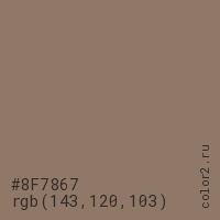 Цвет #8F7867 в цветовой модели RGB обозначается тремя октетами (143, 120, 103) в десятичном формате и #8F7867 в шестнадцатиричном (hex) формате, которые являются интенсивностью красного 143 (hex 8F), интенсивность зелёного 120 (hex 78) и интенсивность синего 103 (hex 67).