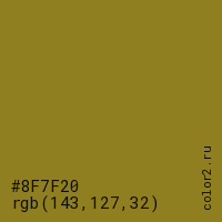 Цвет #8F7F20 в цветовой модели RGB обозначается тремя октетами (143, 127, 32) в десятичном формате и #8F7F20 в шестнадцатиричном (hex) формате, которые являются интенсивностью красного 143 (hex 8F), интенсивность зелёного 127 (hex 7F) и интенсивность синего 32 (hex 20).