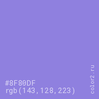 Цвет #8F80DF в цветовой модели RGB обозначается тремя октетами (143, 128, 223) в десятичном формате и #8F80DF в шестнадцатиричном (hex) формате, которые являются интенсивностью красного 143 (hex 8F), интенсивность зелёного 128 (hex 80) и интенсивность синего 223 (hex DF).