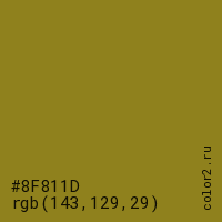 Цвет #8F811D в цветовой модели RGB обозначается тремя октетами (143, 129, 29) в десятичном формате и #8F811D в шестнадцатиричном (hex) формате, которые являются интенсивностью красного 143 (hex 8F), интенсивность зелёного 129 (hex 81) и интенсивность синего 29 (hex 1D).