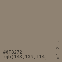 Цвет #8F8272 в цветовой модели RGB обозначается тремя октетами (143, 130, 114) в десятичном формате и #8F8272 в шестнадцатиричном (hex) формате, которые являются интенсивностью красного 143 (hex 8F), интенсивность зелёного 130 (hex 82) и интенсивность синего 114 (hex 72).
