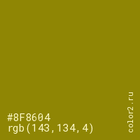 Цвет #8F8604 в цветовой модели RGB обозначается тремя октетами (143, 134, 4) в десятичном формате и #8F8604 в шестнадцатиричном (hex) формате, которые являются интенсивностью красного 143 (hex 8F), интенсивность зелёного 134 (hex 86) и интенсивность синего 4 (hex 04).