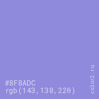 Цвет #8F8ADC в цветовой модели RGB обозначается тремя октетами (143, 138, 220) в десятичном формате и #8F8ADC в шестнадцатиричном (hex) формате, которые являются интенсивностью красного 143 (hex 8F), интенсивность зелёного 138 (hex 8A) и интенсивность синего 220 (hex DC).