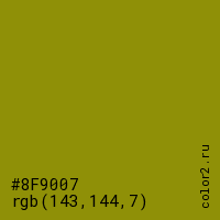 Цвет #8F9007 в цветовой модели RGB обозначается тремя октетами (143, 144, 7) в десятичном формате и #8F9007 в шестнадцатиричном (hex) формате, которые являются интенсивностью красного 143 (hex 8F), интенсивность зелёного 144 (hex 90) и интенсивность синего 7 (hex 07).