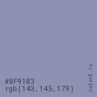 Цвет #8F91B3 в цветовой модели RGB обозначается тремя октетами (143, 145, 179) в десятичном формате и #8F91B3 в шестнадцатиричном (hex) формате, которые являются интенсивностью красного 143 (hex 8F), интенсивность зелёного 145 (hex 91) и интенсивность синего 179 (hex B3).