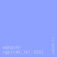 Цвет #8FA1FF в цветовой модели RGB обозначается тремя октетами (143, 161, 255) в десятичном формате и #8FA1FF в шестнадцатиричном (hex) формате, которые являются интенсивностью красного 143 (hex 8F), интенсивность зелёного 161 (hex A1) и интенсивность синего 255 (hex FF).