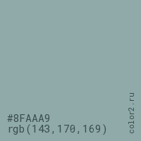 Цвет #8FAAA9 в цветовой модели RGB обозначается тремя октетами (143, 170, 169) в десятичном формате и #8FAAA9 в шестнадцатиричном (hex) формате, которые являются интенсивностью красного 143 (hex 8F), интенсивность зелёного 170 (hex AA) и интенсивность синего 169 (hex A9).