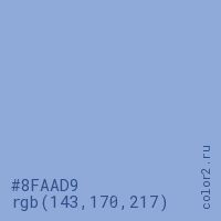 Цвет #8FAAD9 в цветовой модели RGB обозначается тремя октетами (143, 170, 217) в десятичном формате и #8FAAD9 в шестнадцатиричном (hex) формате, которые являются интенсивностью красного 143 (hex 8F), интенсивность зелёного 170 (hex AA) и интенсивность синего 217 (hex D9).