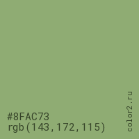 Цвет #8FAC73 в цветовой модели RGB обозначается тремя октетами (143, 172, 115) в десятичном формате и #8FAC73 в шестнадцатиричном (hex) формате, которые являются интенсивностью красного 143 (hex 8F), интенсивность зелёного 172 (hex AC) и интенсивность синего 115 (hex 73).