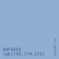 Цвет #8FAED2 в цветовой модели RGB обозначается тремя октетами (143, 174, 210) в десятичном формате и #8FAED2 в шестнадцатиричном (hex) формате, которые являются интенсивностью красного 143 (hex 8F), интенсивность зелёного 174 (hex AE) и интенсивность синего 210 (hex D2).