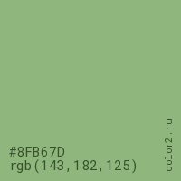 Цвет #8FB67D в цветовой модели RGB обозначается тремя октетами (143, 182, 125) в десятичном формате и #8FB67D в шестнадцатиричном (hex) формате, которые являются интенсивностью красного 143 (hex 8F), интенсивность зелёного 182 (hex B6) и интенсивность синего 125 (hex 7D).