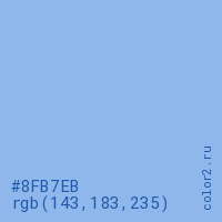 Цвет #8FB7EB в цветовой модели RGB обозначается тремя октетами (143, 183, 235) в десятичном формате и #8FB7EB в шестнадцатиричном (hex) формате, которые являются интенсивностью красного 143 (hex 8F), интенсивность зелёного 183 (hex B7) и интенсивность синего 235 (hex EB).
