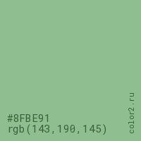 Цвет #8FBE91 в цветовой модели RGB обозначается тремя октетами (143, 190, 145) в десятичном формате и #8FBE91 в шестнадцатиричном (hex) формате, которые являются интенсивностью красного 143 (hex 8F), интенсивность зелёного 190 (hex BE) и интенсивность синего 145 (hex 91).