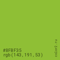 Цвет #8FBF35 в цветовой модели RGB обозначается тремя октетами (143, 191, 53) в десятичном формате и #8FBF35 в шестнадцатиричном (hex) формате, которые являются интенсивностью красного 143 (hex 8F), интенсивность зелёного 191 (hex BF) и интенсивность синего 53 (hex 35).