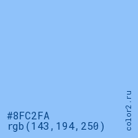 Цвет #8FC2FA в цветовой модели RGB обозначается тремя октетами (143, 194, 250) в десятичном формате и #8FC2FA в шестнадцатиричном (hex) формате, которые являются интенсивностью красного 143 (hex 8F), интенсивность зелёного 194 (hex C2) и интенсивность синего 250 (hex FA).