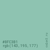 Цвет #8FC3B1 в цветовой модели RGB обозначается тремя октетами (143, 195, 177) в десятичном формате и #8FC3B1 в шестнадцатиричном (hex) формате, которые являются интенсивностью красного 143 (hex 8F), интенсивность зелёного 195 (hex C3) и интенсивность синего 177 (hex B1).