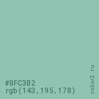 Цвет #8FC3B2 в цветовой модели RGB обозначается тремя октетами (143, 195, 178) в десятичном формате и #8FC3B2 в шестнадцатиричном (hex) формате, которые являются интенсивностью красного 143 (hex 8F), интенсивность зелёного 195 (hex C3) и интенсивность синего 178 (hex B2).