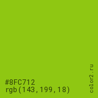 Цвет #8FC712 в цветовой модели RGB обозначается тремя октетами (143, 199, 18) в десятичном формате и #8FC712 в шестнадцатиричном (hex) формате, которые являются интенсивностью красного 143 (hex 8F), интенсивность зелёного 199 (hex C7) и интенсивность синего 18 (hex 12).