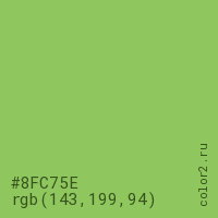 Цвет #8FC75E в цветовой модели RGB обозначается тремя октетами (143, 199, 94) в десятичном формате и #8FC75E в шестнадцатиричном (hex) формате, которые являются интенсивностью красного 143 (hex 8F), интенсивность зелёного 199 (hex C7) и интенсивность синего 94 (hex 5E).