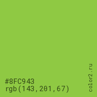 Цвет #8FC943 в цветовой модели RGB обозначается тремя октетами (143, 201, 67) в десятичном формате и #8FC943 в шестнадцатиричном (hex) формате, которые являются интенсивностью красного 143 (hex 8F), интенсивность зелёного 201 (hex C9) и интенсивность синего 67 (hex 43).