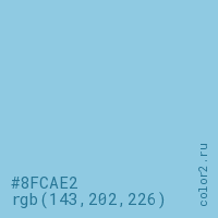 Цвет #8FCAE2 в цветовой модели RGB обозначается тремя октетами (143, 202, 226) в десятичном формате и #8FCAE2 в шестнадцатиричном (hex) формате, которые являются интенсивностью красного 143 (hex 8F), интенсивность зелёного 202 (hex CA) и интенсивность синего 226 (hex E2).
