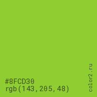 Цвет #8FCD30 в цветовой модели RGB обозначается тремя октетами (143, 205, 48) в десятичном формате и #8FCD30 в шестнадцатиричном (hex) формате, которые являются интенсивностью красного 143 (hex 8F), интенсивность зелёного 205 (hex CD) и интенсивность синего 48 (hex 30).
