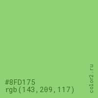 Цвет #8FD175 в цветовой модели RGB обозначается тремя октетами (143, 209, 117) в десятичном формате и #8FD175 в шестнадцатиричном (hex) формате, которые являются интенсивностью красного 143 (hex 8F), интенсивность зелёного 209 (hex D1) и интенсивность синего 117 (hex 75).