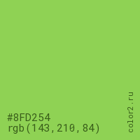 Цвет #8FD254 в цветовой модели RGB обозначается тремя октетами (143, 210, 84) в десятичном формате и #8FD254 в шестнадцатиричном (hex) формате, которые являются интенсивностью красного 143 (hex 8F), интенсивность зелёного 210 (hex D2) и интенсивность синего 84 (hex 54).
