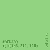 Цвет #8FD380 в цветовой модели RGB обозначается тремя октетами (143, 211, 128) в десятичном формате и #8FD380 в шестнадцатиричном (hex) формате, которые являются интенсивностью красного 143 (hex 8F), интенсивность зелёного 211 (hex D3) и интенсивность синего 128 (hex 80).