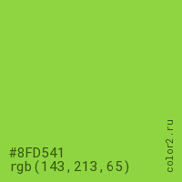 Цвет #8FD541 в цветовой модели RGB обозначается тремя октетами (143, 213, 65) в десятичном формате и #8FD541 в шестнадцатиричном (hex) формате, которые являются интенсивностью красного 143 (hex 8F), интенсивность зелёного 213 (hex D5) и интенсивность синего 65 (hex 41).