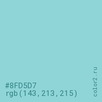 Цвет #8FD5D7 в цветовой модели RGB обозначается тремя октетами (143, 213, 215) в десятичном формате и #8FD5D7 в шестнадцатиричном (hex) формате, которые являются интенсивностью красного 143 (hex 8F), интенсивность зелёного 213 (hex D5) и интенсивность синего 215 (hex D7).