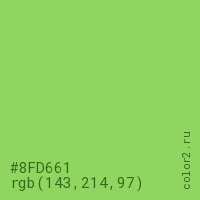 Цвет #8FD661 в цветовой модели RGB обозначается тремя октетами (143, 214, 97) в десятичном формате и #8FD661 в шестнадцатиричном (hex) формате, которые являются интенсивностью красного 143 (hex 8F), интенсивность зелёного 214 (hex D6) и интенсивность синего 97 (hex 61).