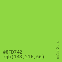 Цвет #8FD742 в цветовой модели RGB обозначается тремя октетами (143, 215, 66) в десятичном формате и #8FD742 в шестнадцатиричном (hex) формате, которые являются интенсивностью красного 143 (hex 8F), интенсивность зелёного 215 (hex D7) и интенсивность синего 66 (hex 42).