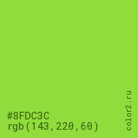Цвет #8FDC3C в цветовой модели RGB обозначается тремя октетами (143, 220, 60) в десятичном формате и #8FDC3C в шестнадцатиричном (hex) формате, которые являются интенсивностью красного 143 (hex 8F), интенсивность зелёного 220 (hex DC) и интенсивность синего 60 (hex 3C).