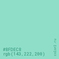 Цвет #8FDEC8 в цветовой модели RGB обозначается тремя октетами (143, 222, 200) в десятичном формате и #8FDEC8 в шестнадцатиричном (hex) формате, которые являются интенсивностью красного 143 (hex 8F), интенсивность зелёного 222 (hex DE) и интенсивность синего 200 (hex C8).