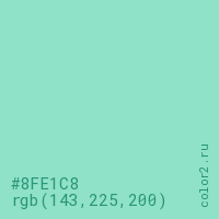 Цвет #8FE1C8 в цветовой модели RGB обозначается тремя октетами (143, 225, 200) в десятичном формате и #8FE1C8 в шестнадцатиричном (hex) формате, которые являются интенсивностью красного 143 (hex 8F), интенсивность зелёного 225 (hex E1) и интенсивность синего 200 (hex C8).